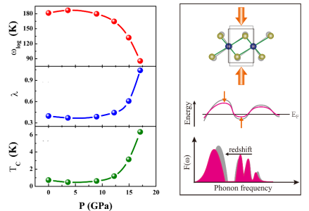 图1、1T-TiTe2在单轴压下的平均声子振动频率(ωlog)、电声耦合强度和超导转变温度的变化情况(左)以及单轴压力对材料性质影响的示意图(右)