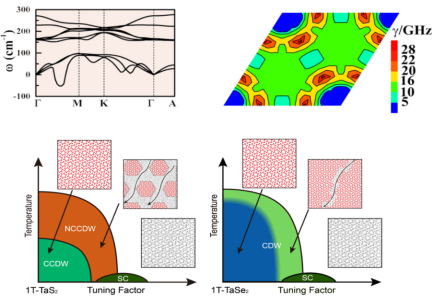 图2、1T-TaSe2的声子谱(左上)以及对应的声子线宽(右上),1T-TaS2(左下)和1T-TaSe2(右下)调控示意图