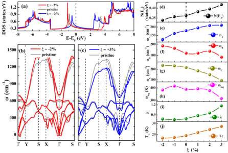 图3、应力下硼烯的态密度、声子谱、ωlog、电声耦合强度和超导转变温度等的变化图