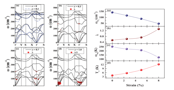 图4、磷烯在电荷掺杂下的声子谱(左)和应力下的ωlog、电声耦合强度和超导转变温度等的变化情况(右)
